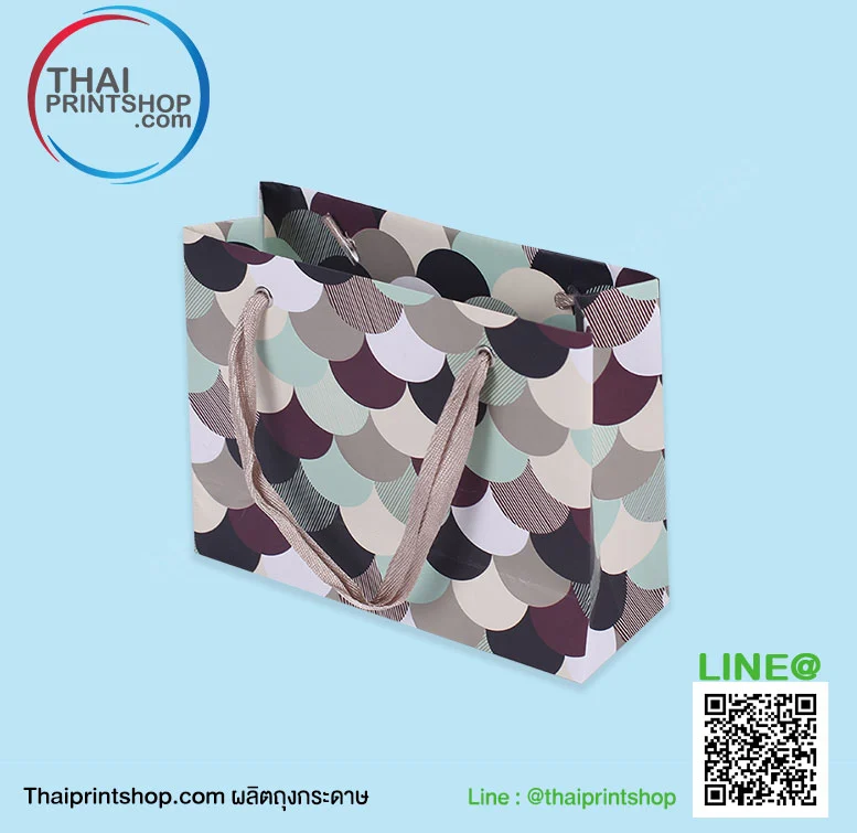 ถุงขนาดสำเร็จ ใช้กระดาษอาร์ตการ์ด 2 หน้า 190 แกรม พิมพ์ 4 สี พิมพ์พื้นถุงสีอ่อน หน้าหลังพิมพ์ลายเดียวกัน